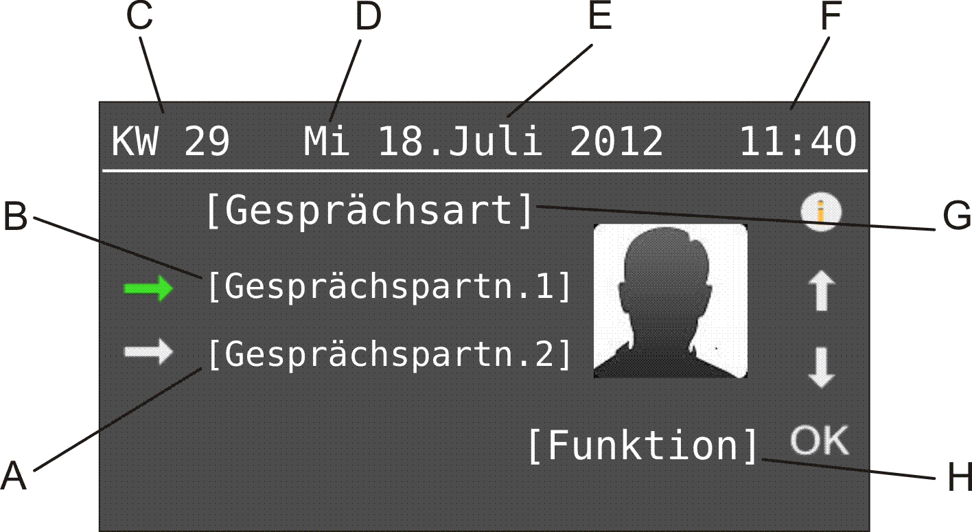 Ist ein dem Namen zugehöriges Bild auf einer SD-Karte im Telefon gespeichert, wird dieses im Display angezeigt (siehe Kapitel Telefonbuch und Listen > Telefonbuch > Bilder zum Telefonbuch hinzufügen). Ist dies nicht der Fall, wird das hier dargestellte Avatar-Bild im Display angezeigt.