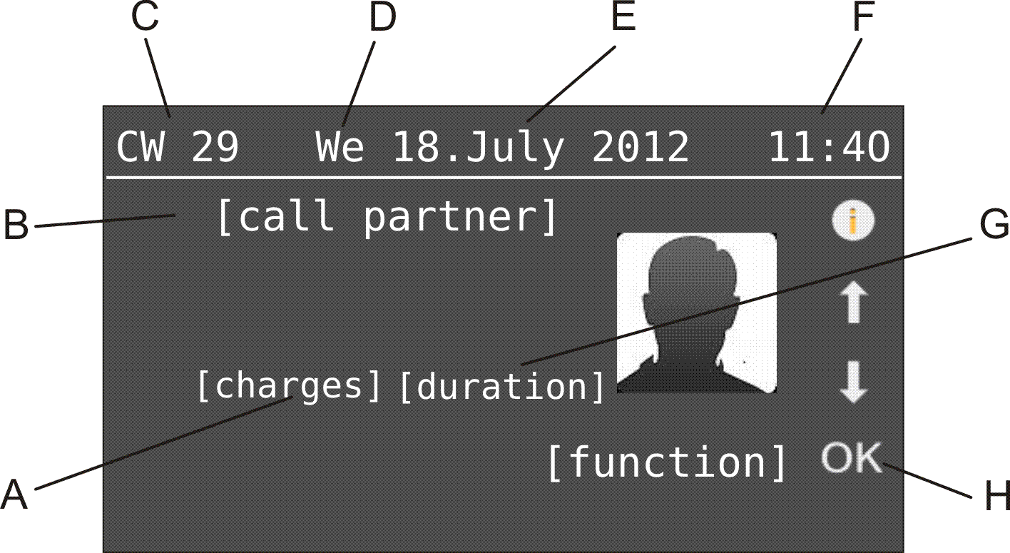 If a contact image has been stored on the SD card and is assigned to a contact, it will be displayed (see chapter Telephone Book and Lists > Telephone Book > Adding contact images to the telephone book). If this is not the case, an Avatar image printed here will be displayed.