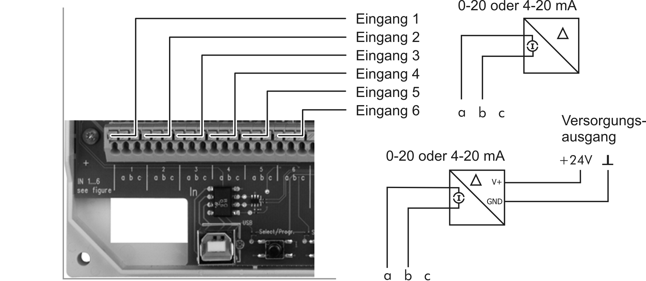 Hinweise: Die Belegung der Klemmen ist abhängig von der Kontaktart, die in der Konfiguration eingestellt wird. Soll ein Messsensor mit Stromausgang (0-20 mA oder 4-20 mA) angeschlossen werden, legen Sie die Adern an den Klemmen „a“ und „b“ auf. Die Klemme „c“ ist in dieser Kontaktart nicht belegt.