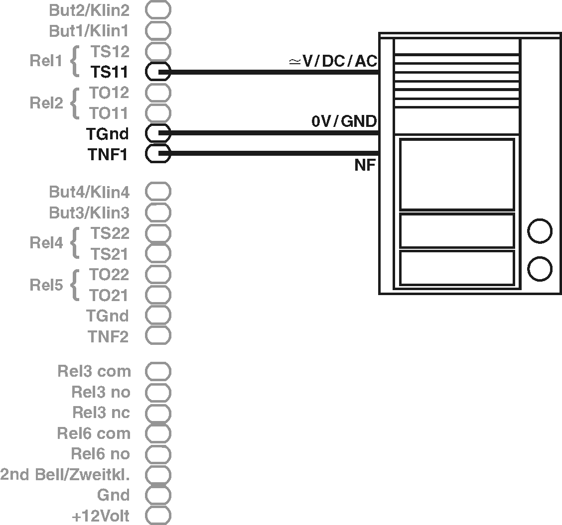4.Verbinden Sie die Klemme TNF1 (oder TNF2) mit dem Ein-/Ausgang der NF-Spannung Ihres Türfreisprechsystems (z. B. bezeichnet mit NF).