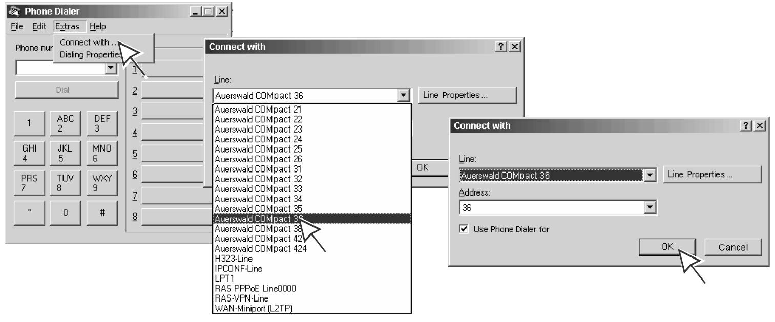 To perform a simple function check of the TAPI driver (TSP) as well as the settings configured in the PBX, use the dialling help on Windows on the server PC.