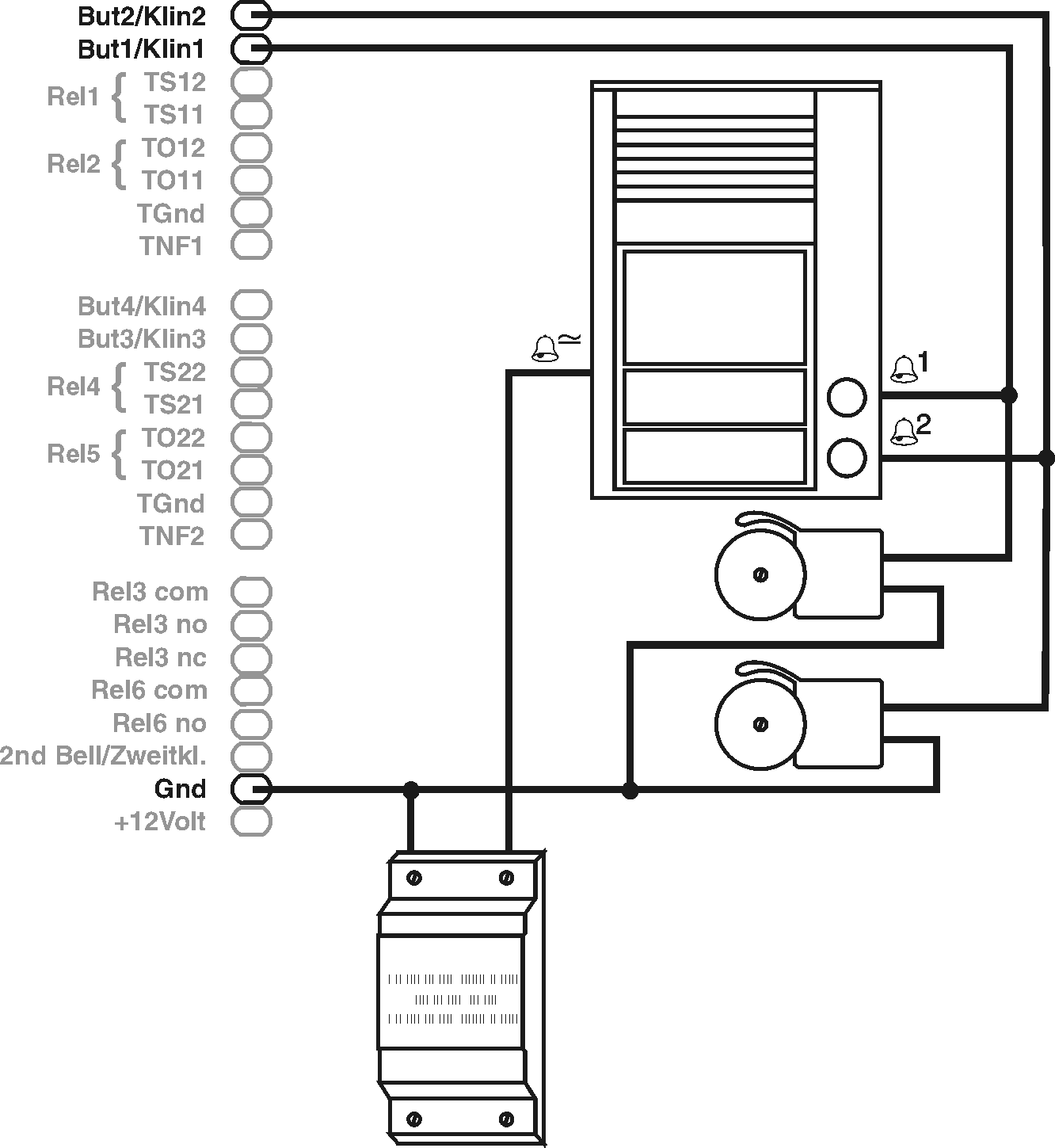 1) and with the first door bell. 3.Connect the But2/Klin2 terminal to the contact of the second door bell button (e. g. labelled