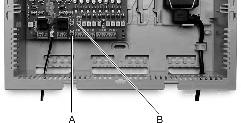 2.Press the Default button on the COMpact 4000 interface board within 2 seconds and hold it for 10-15 seconds.