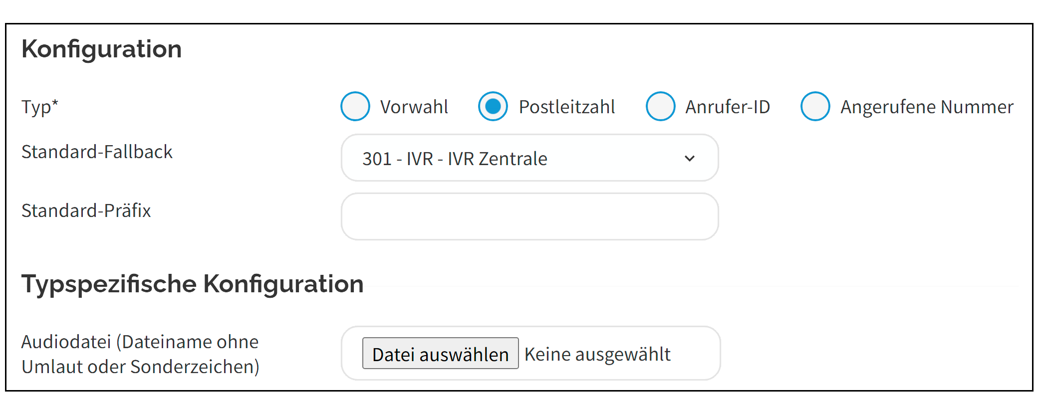 Audiodatei | Laden Sie eine Audiodatei hoch, die den Anrufer auffordert, eine Postleitzahl einzugeben (Sie können auch die Service-Nebenstelle 8805 verwenden, um einen Text online aufzunehmen). |