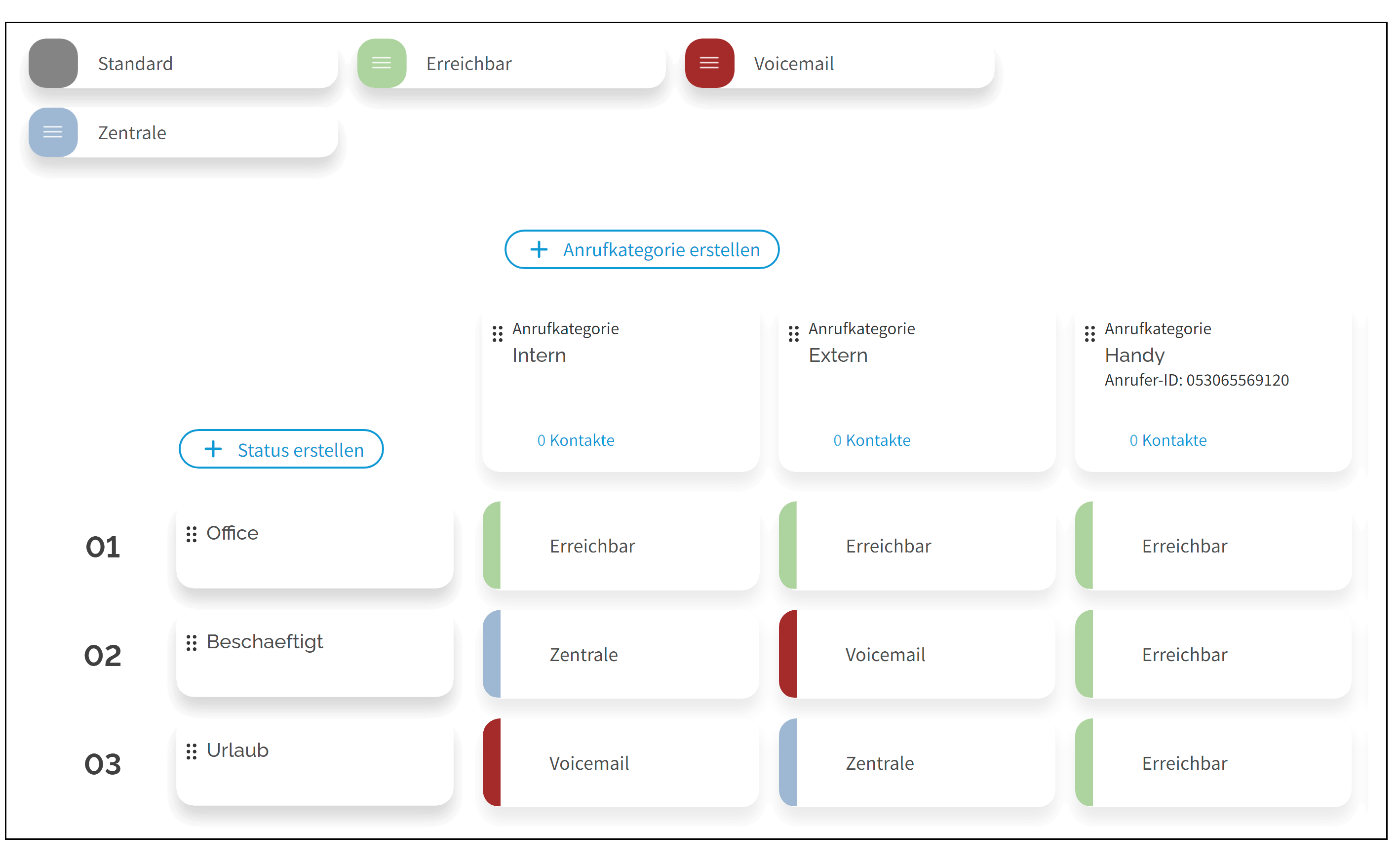Mit der REACH-Matrix können Sie Ihre Verfügbarkeit für Ihre benutzerdefinierten Anrufkategorien und Profile konfigurieren.