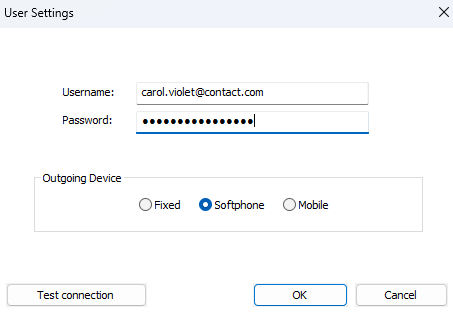 4 . Wählen Sie unter Outgoing Device das Gerät des Benutzers aus, das Sie monitoren möchten. Wenn ein neuer Anruf über den Contact TAPI Service Provider gestartet wird, wird das ausgewählte Gerät für den Anruf verwendet.